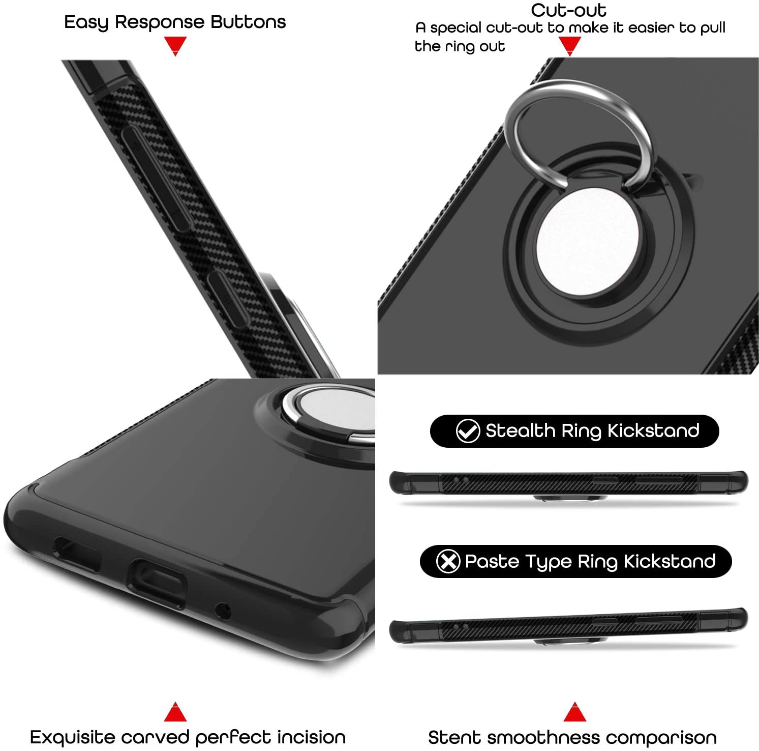 - Built-in Ring Holder- Makes it easier to carry your iPhone and prevents drops. Also acts as a kickstand to provide hands-free viewing and multi-angle support.